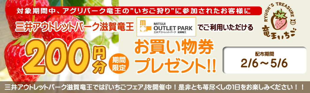 当HPより、いちご狩りをご予約のお客様に三井アウトレットパーク滋賀竜王で使えるお買物・お食事券200円分(引換券)プレゼント!